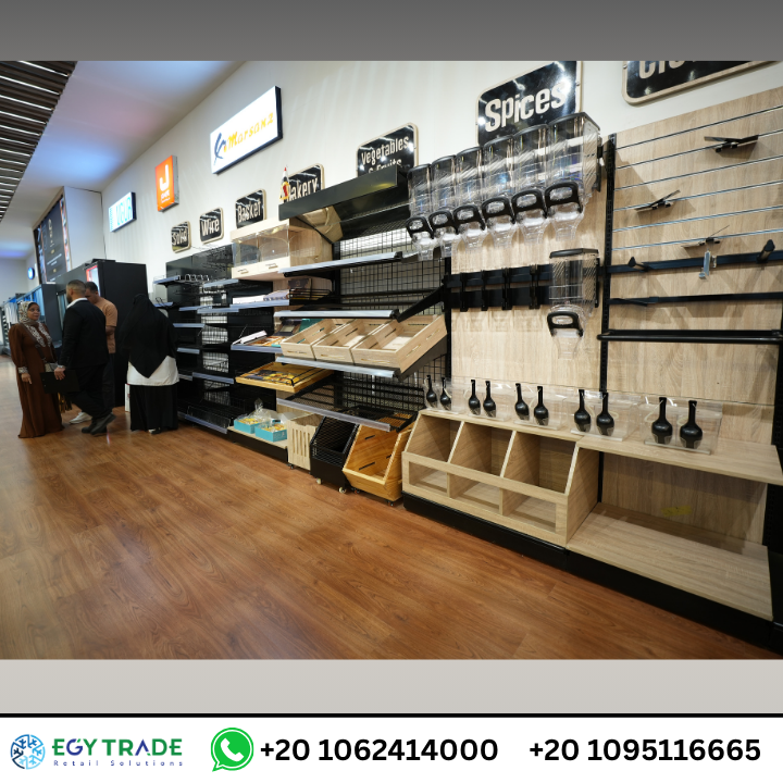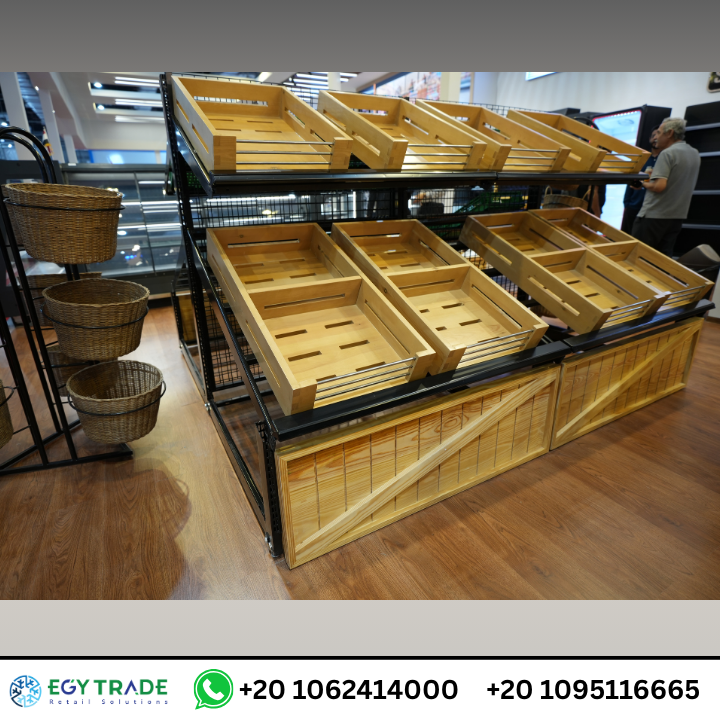 الهيكل المعدني الأسود يمنح ثباتًا عاليًا، بينما القاعدة الخشبية السفلية تضيف طابعًا دافئًا يبرز المنتجات الطازجة.