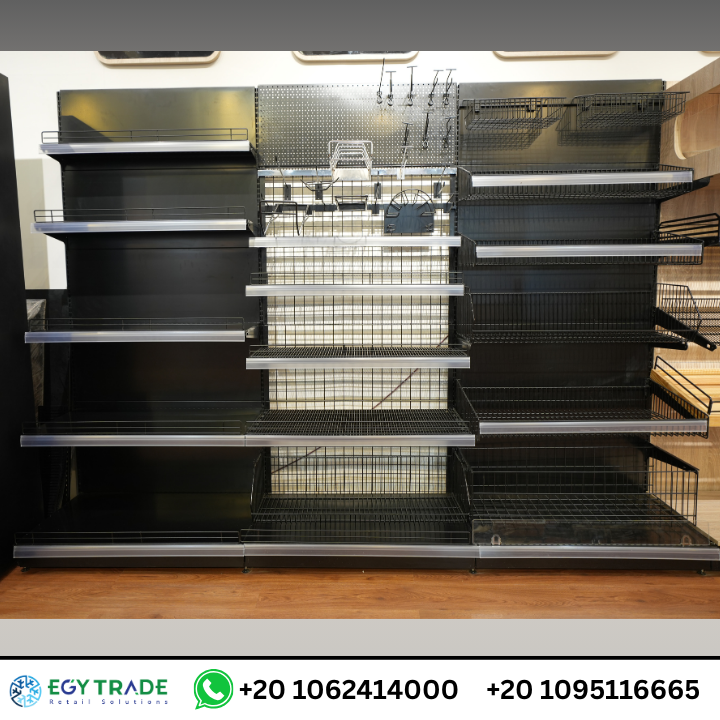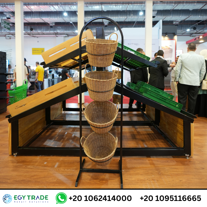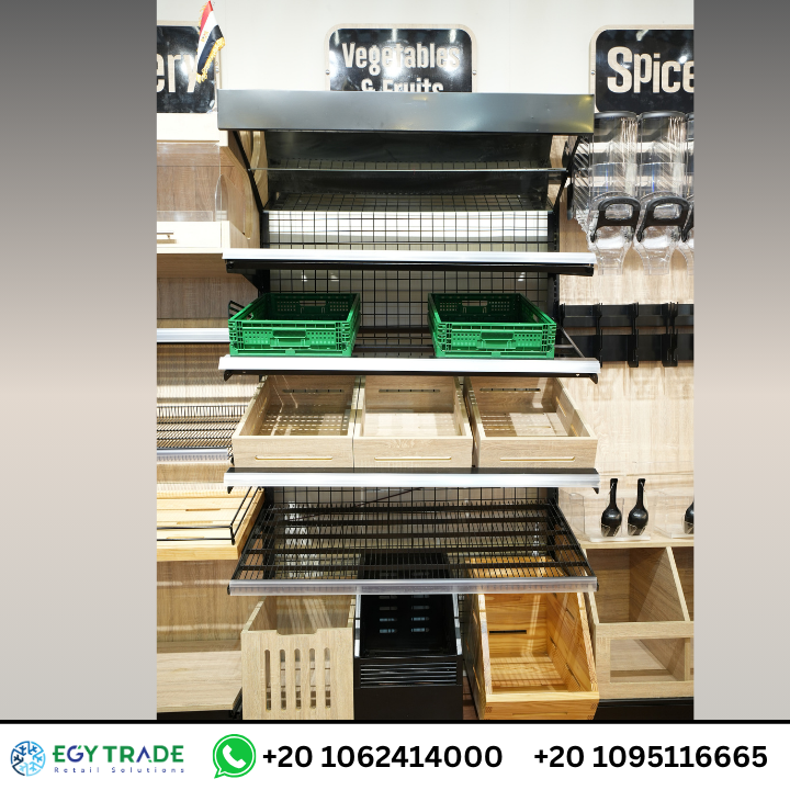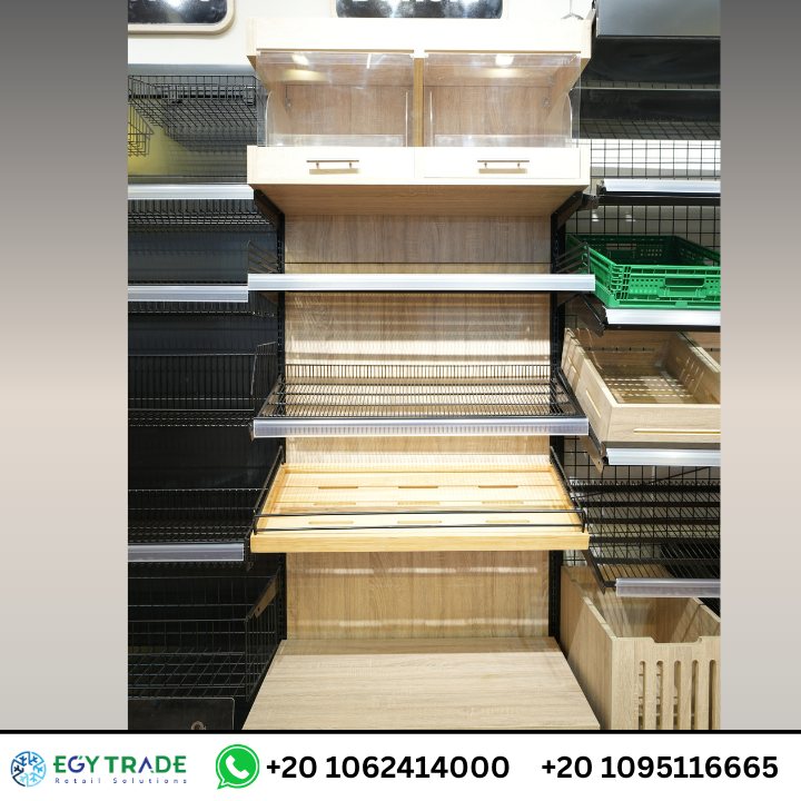 تُظهر الصور اعتماد وحدات عرض خشبية بتصميم مائل يسهل رؤية المنتجات وسحبها، مثبتة على هيكل معدني أسود يعزز قوة التحمل.