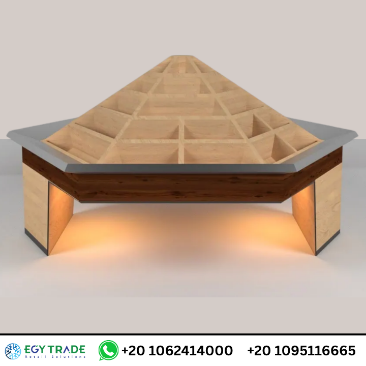 هذه الطاولة السداسية بتصميم هرمي تمنح قسم الخضار والفاكهة لمسة فاخرة ومظهرًا جاذبًا للزبائن، وتُعد من أفضل حلول العرض التي تعتمد عليها اماكن بيع تجهيزات السوبر ماركت لتجهيز المساحات المميزة.