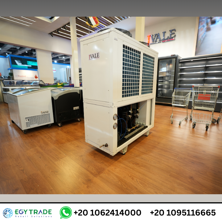 - المكوّنات: ضاغط تبريد صناعي، مبادل حراري، مراوح تبريد علوية، خطوط غاز تبريد.