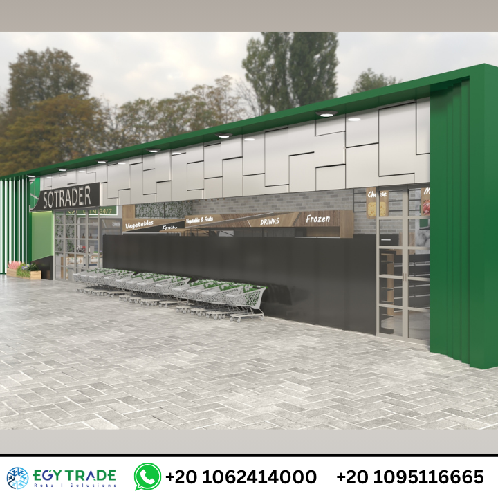 واجهة خارجية احترافية لمشروعات مشروعات سوبر ماركت تشمل لافتة ومدخل ومساحة عربات، مناسبة للتجهيزات التجارية مع إمكانية عرض سعر مباشر.