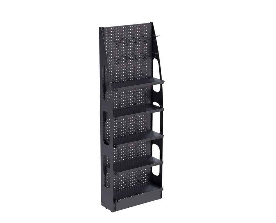يتميز بواجهة مثقّبة تسمح بتثبيت الشوك والأرفف بسهولة مما يوفر مرونة في عرض أنواع مختلفة من المنتجات مثل الإكسسوارات، الأدوات المنزلية أو السلع المغلفة
