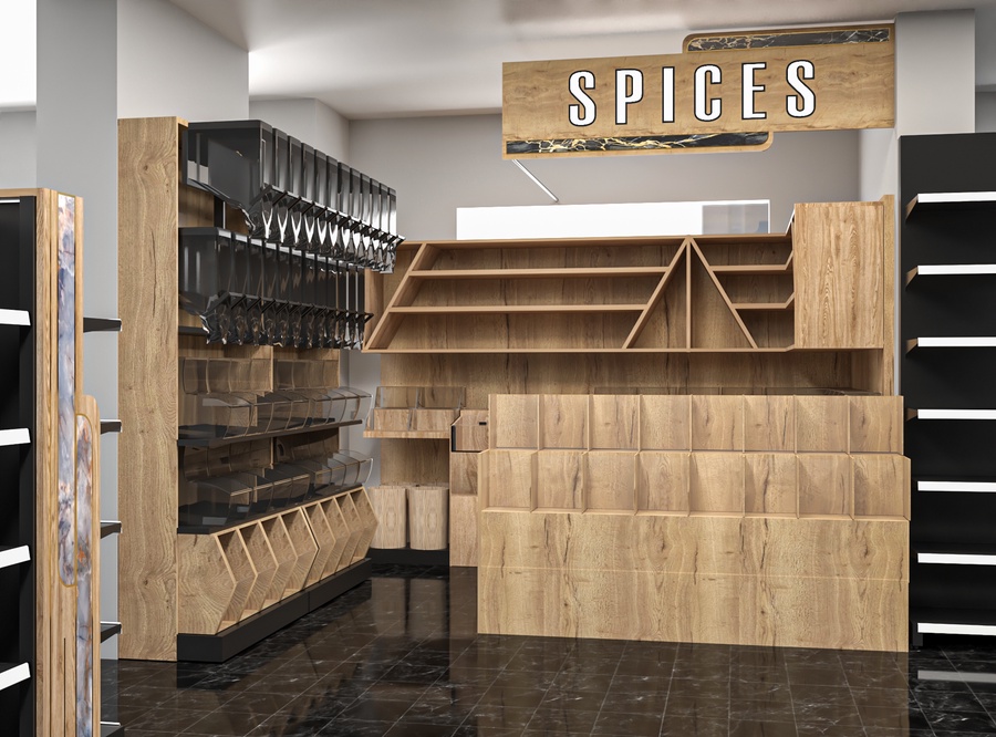قسم بهارات سوبر ماركت – تصميم 2D من إيجي تريد لتجهيزات عرض التوابل
