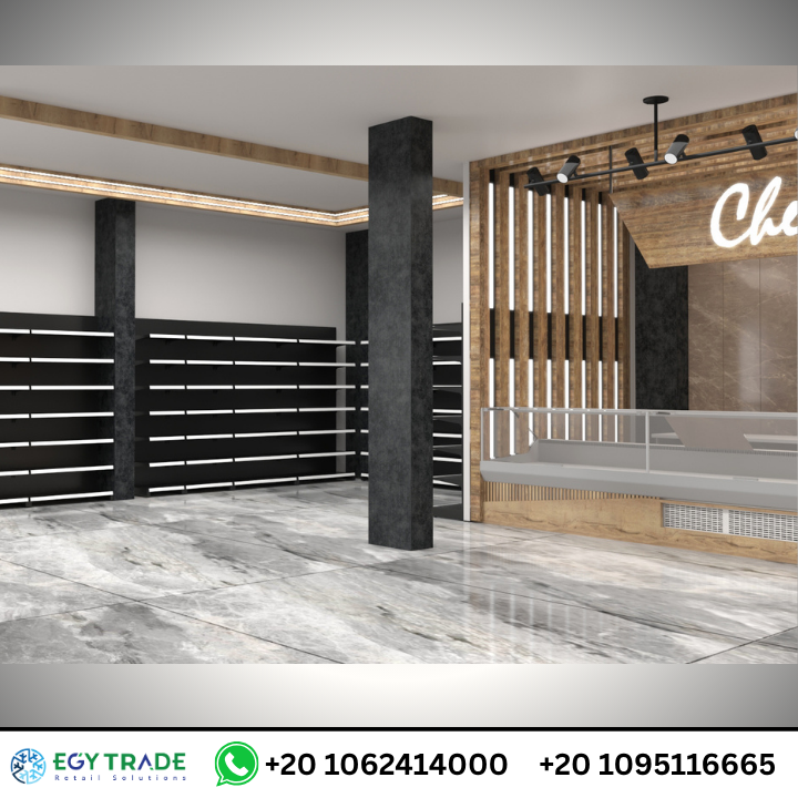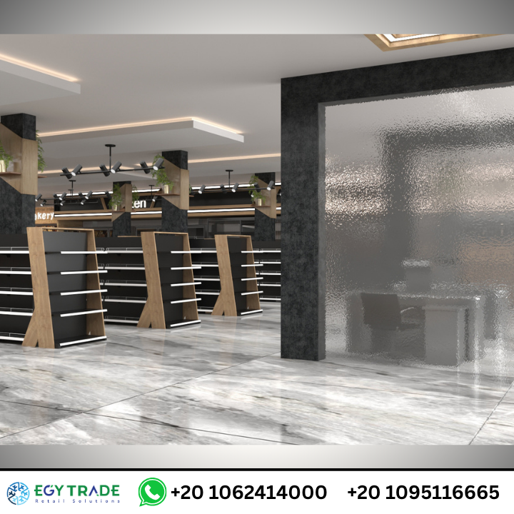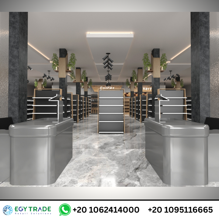 - أرفف بيضاء أو رمادية لإبراز المنتجات.
