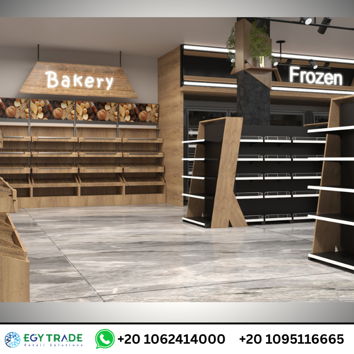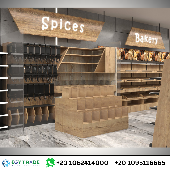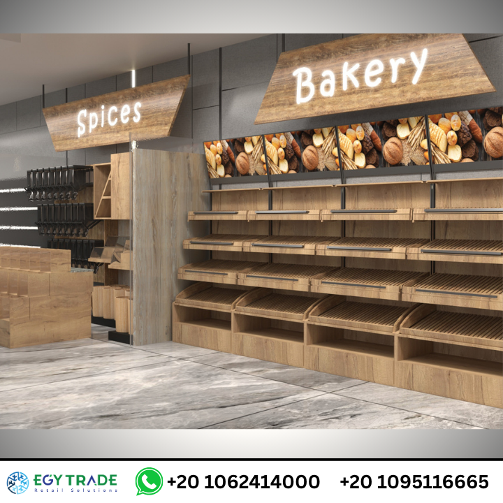 قسم Bakery تم تجهيزه بوحدات عرض خشبية ذات مستويات متعددة تشمل:
