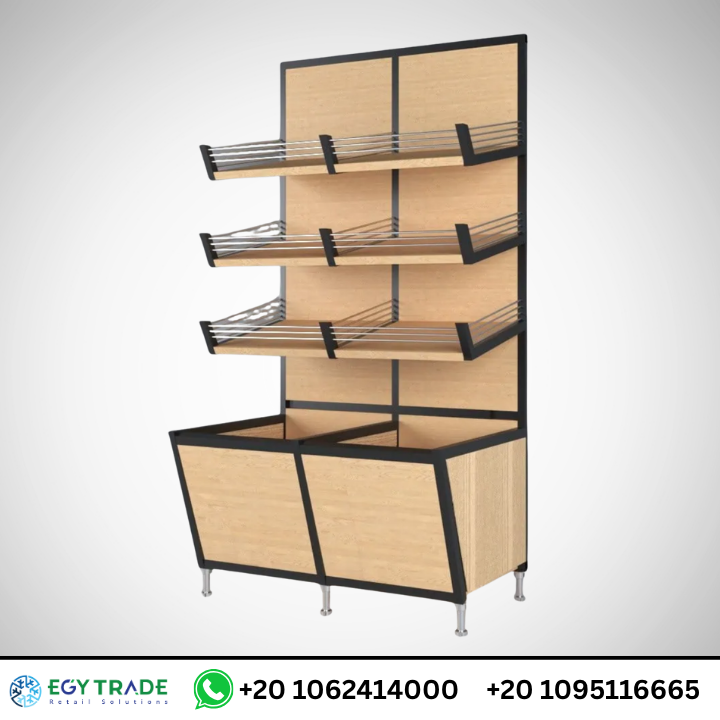 هذه الوحدة الخشبية المدمجة مع قواعد معدنية تعد من أهم حلول العرض داخل السوبر ماركت، خاصة لقسم الفاكهة والخضار. تصميمها عملي ويوفر تنظيمًا ممتازًا للمنتجات، مما يجعلها اختيارًا مميزًا للمحال التي تعتمد على خدمات شركات تجهيز السوبر ماركت في مصر وتحتاج إلى رفع كفاءة تجهيز أرفف محلات بأفضل جودة.