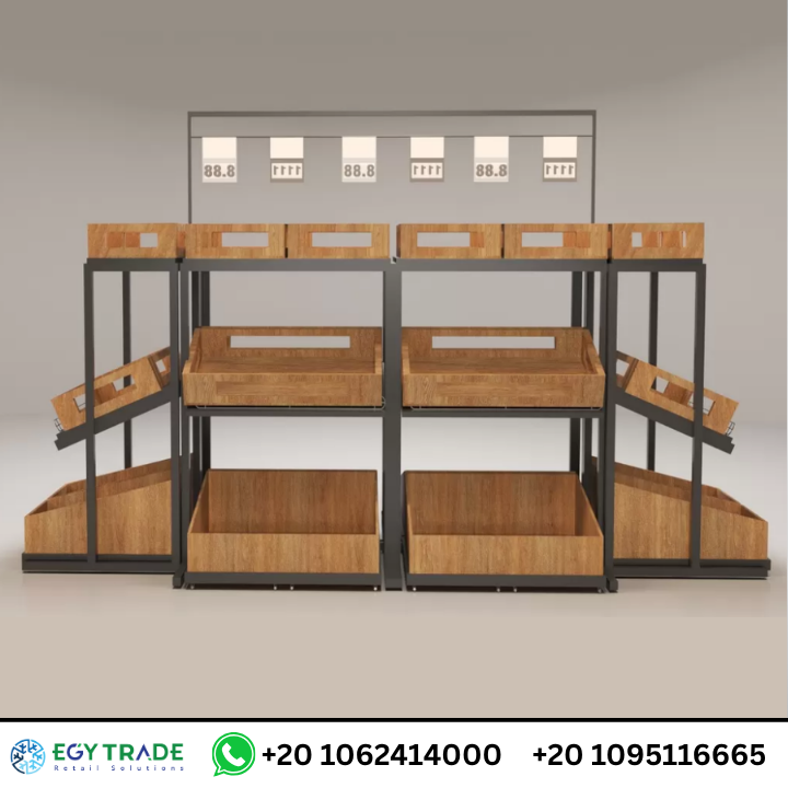 هذه الوحدة المعدنية–الخشبية المتعددة المستويات مصممة خصيصًا لتقديم الخضار والفاكهة بشكل منظم وواضح داخل السوبر ماركت، مما يجعلها خيارًا مميزًا للمشاريع التي تنفذها شركة تجهيز سوبر ماركت متكاملة.